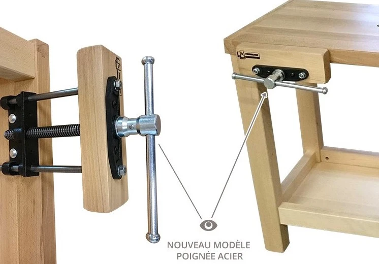 Ensemble vendu seul (mécanisme de presse + levier) sans mordache bois et sans boulons/tire-fond de fixation (2 trous sont prévu dans le mors avant pour fixer facilement un morceau de hêtre massif 40 x 300 mm par exemple en guise de mordache) ou vendu complet et monté avec établi.
