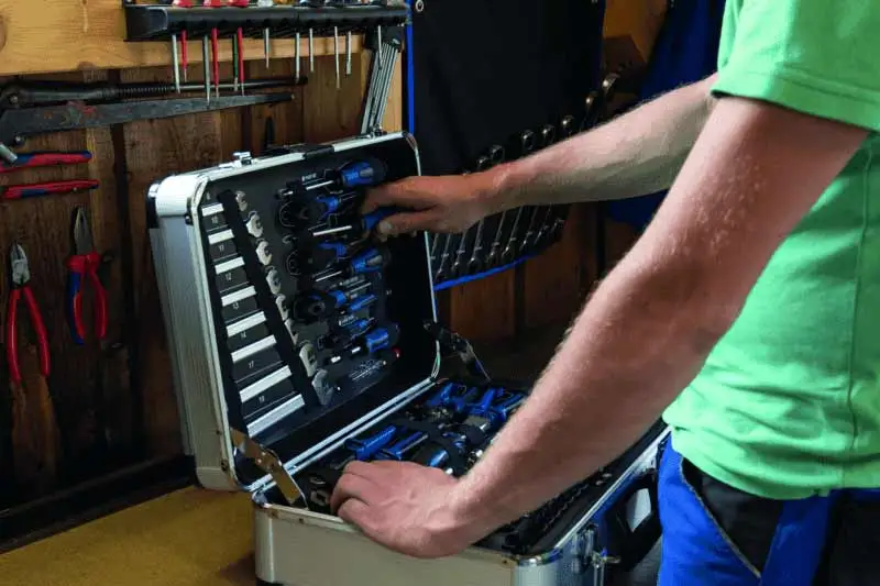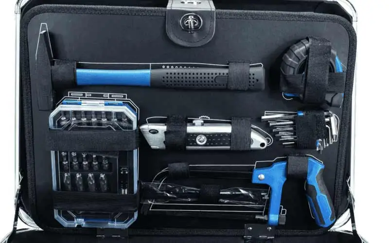 Chaque outil a sa place et est donc toujours à portée de main. Lorsque l’on ouvre la mallette, les outils les plus usuels sont tout de suite prêts à être saisis: entre autres, la pince universelle, le cliquet avec diverses douilles, la pince multiprise, la pince coupante, les clés à fourche, les tournevis et le testeur de tension.
